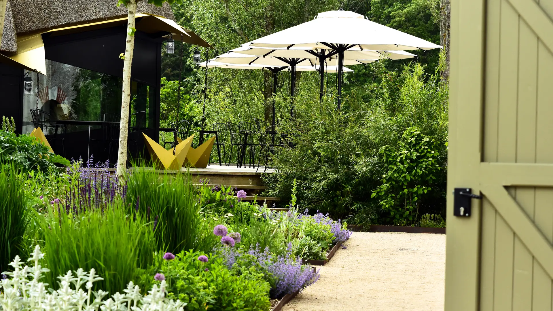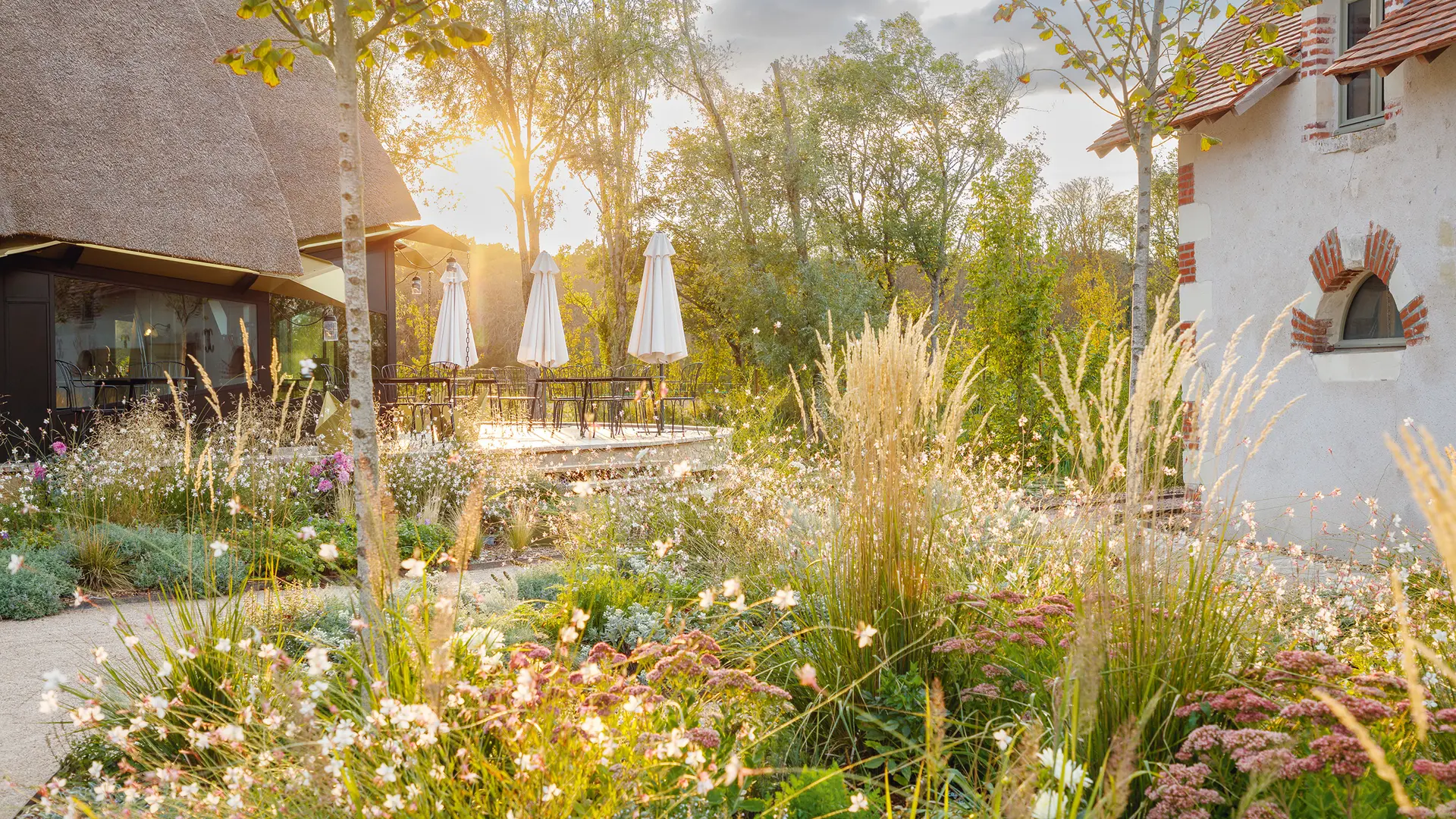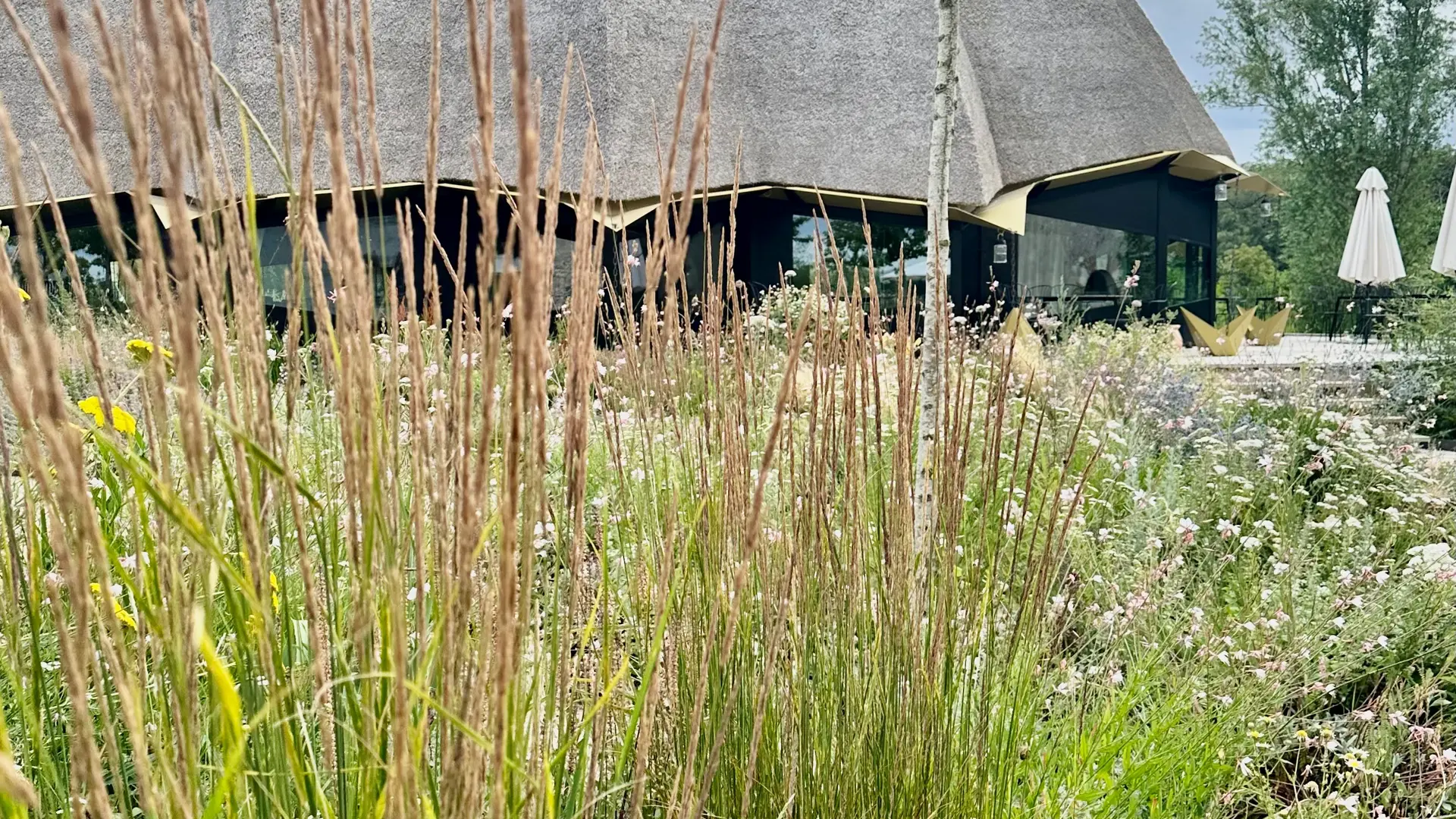 Inspirada tanto en las torres de los castillos renacentistas como en los pajares del campo, una enorme flor de paja alberga una serie de espacios abiertos a la terraza del estanque, al patio de la granja