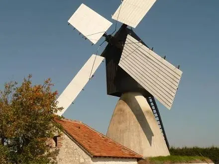 Se reconoce por su construcción de mampostería coronada por un cono que sostiene una cabina de madera (la Hucherolle) que lleva las aspas y se orienta según el viento.